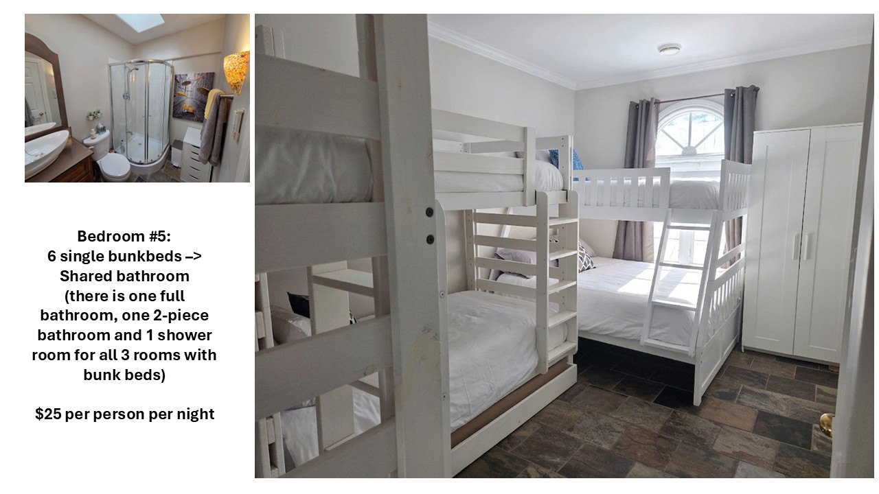 There are 5 single bunk beds and one double bed bunk (bottom bunk, by the window) in this room. Yes, quarters are a little small, but so is the nightly price tag (smile). On the plus side: The beds are comfortable. People sleeping in this room will share one of three bathrooms, with the people in the other two bunk rooms: One full bathroom with shower (shown here), one two-piece bathroom down the hall and one shower room. So far, there have been no morning traffic jams.