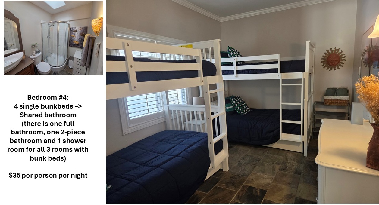 It sleeps 4 in single bunk beds as shown. People sleeping in this room will share one of three bathrooms, with the people in the other two bunk rooms: One full bathroom with shower (shown here), one two-piece bathroom down the hall and one shower room. So far, there have been no morning traffic jams.